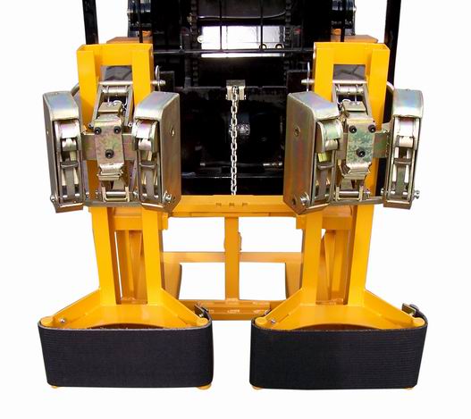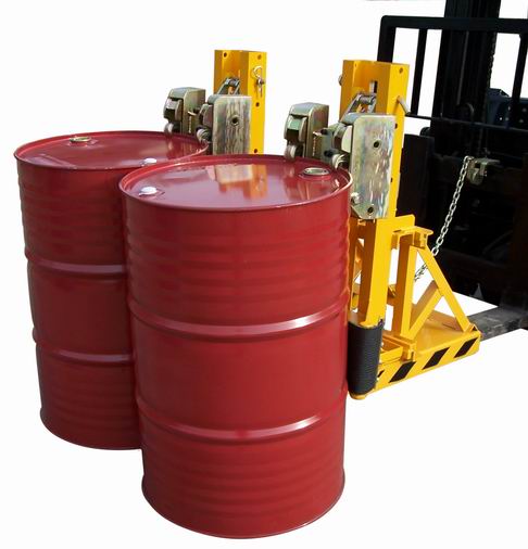 2DE型应用范围: 1. 纯机械结构设计的重型双桶夹具可与叉车方便地配合,仅依靠叉车的动作,不需要其它动力,可自动一次搬运1-2个桶。 2. 能处理更多类型的桶,包括钢,塑料,纤维及箍紧的开口桶;能在集装箱等这样狭小的环境内装卸桶装物资,可极大地提高空间利用率。 3. 全自动机械操作,机架可上下左右进行调整,以适应不同规格的桶。每个桶都有可自动调心的双"鹦鹉嘴"夹爪机构来夹紧,不仅进一步减缓桶缘受力状况,而且对已局部损坏的桶,放置不平的桶都能可靠地进行搬运和堆码。 4. 双倍宽鹦鹉嘴夹爪和双倍宽的皮带护托? 5. 可搬运各种大小的开口以及闭口桶。 6. 机架上的皮带护托可对圆桶提供很好的支持和保护。 7. 与货叉连接的方式可选安全链连接(标配)或快爪夹钳自动的锁紧控制装置(推荐)。 8. 推荐用于每月处理1000 个以上桶的应用场合。