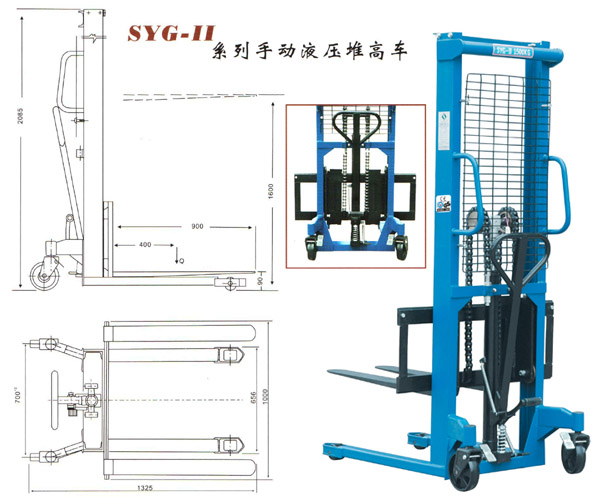 参数: 型号规格 SYG05-16 SYG10-16 SYG15-16 SYG20-16 额定载荷 kg 500 1000 1500 2000 载荷中心 mm 400 货叉最低高度 85 90 货叉最大高度 1600 货叉长度 800 900 货叉外宽 750 950 前插腿中心宽 470 560 最小转弯半径 1110 1250 前后轮轴距 996 1100 前轮基距 213 178 整机长度 1280 1380 整机宽度 800 1000 整机高度 1980 2100 整机重量 kg 155 250 260 285